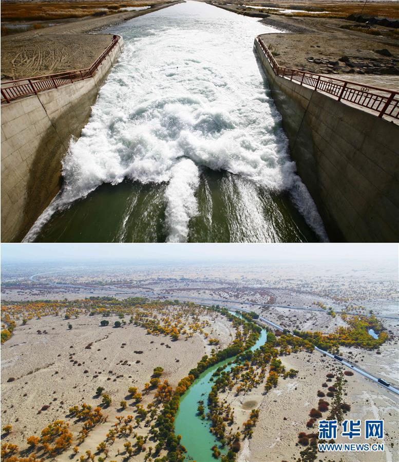 拼版照片:上图为2011年实施的第十二次向塔河下游生态输水,生态水从大西海子水库泄洪闸奔腾而下(2011年10月28日摄);下图为生态水滋养着下游河道两岸的胡杨,阻止了塔克拉玛干与库姆塔格两大沙漠合拢(2017年10月15日无人机拍摄)。 新华社发(肖玉磊 摄)