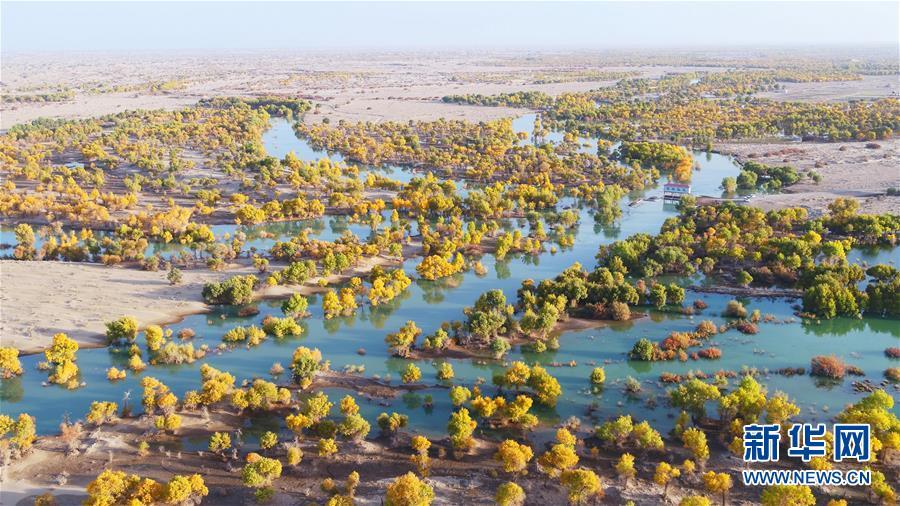 生态水滋养着下游河道两岸的胡杨,阻止了塔克拉玛干与库姆塔格两大沙漠合拢(2017年10月12日无人机拍摄)。 新华社发(肖玉磊 摄)