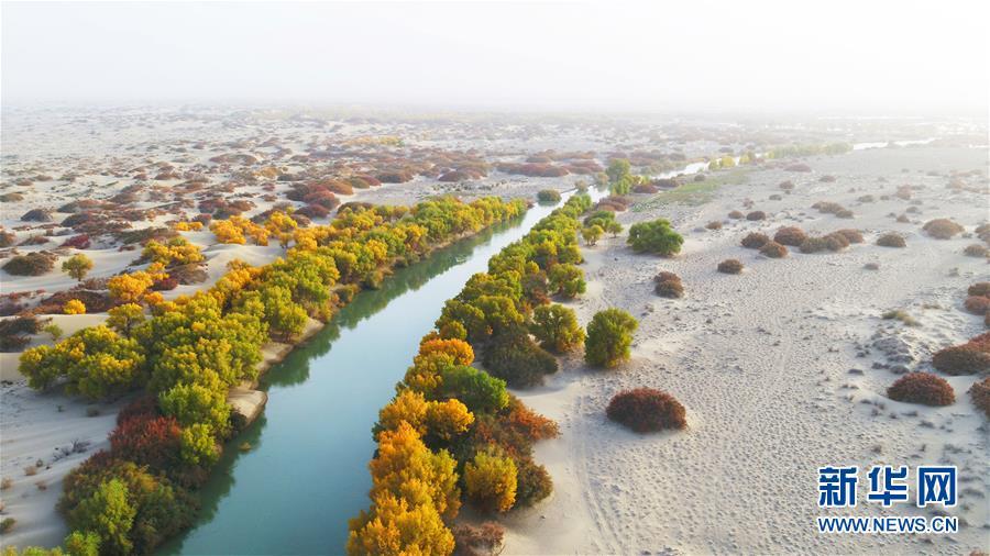 塔里木河在塔克拉玛干与库姆塔格两座沙漠之间流过,两岸的胡杨林构成一道绿色走廊(2017年10月15日无人机拍摄)。 新华社发(肖玉磊 摄)