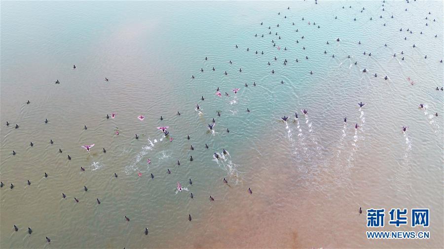 一群水鸟在塔里木河尾闾台特玛湖湖面游弋(2017年10月15日无人机拍摄)。 新华社发(肖玉磊 摄)