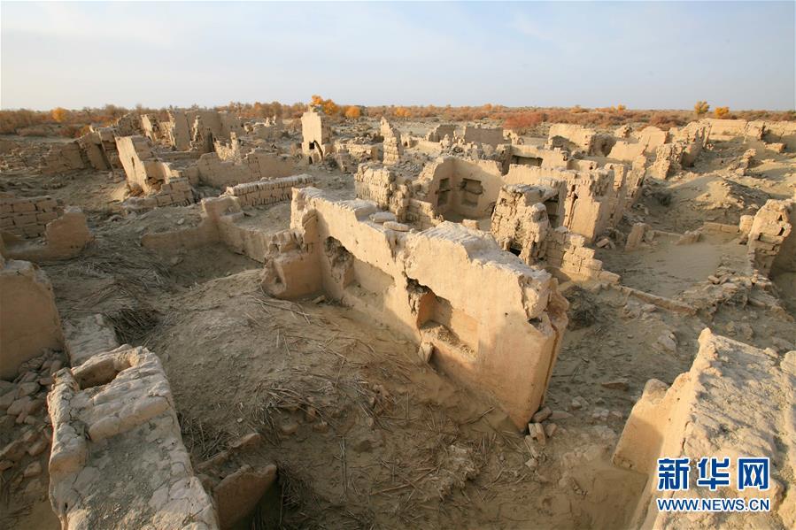 这是英苏村遗址。至上世纪中叶,因赖以生存的塔里木河下游断流,当地村民搬迁,只留下一片废墟(2010年11月4日摄)。 新华社发(肖玉磊 摄)