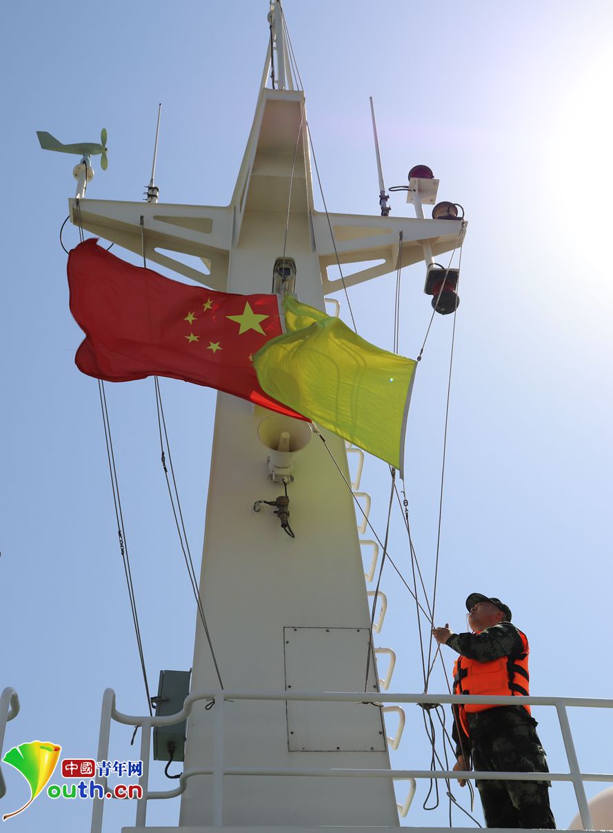 他是话最少却行动敏捷的11年老兵周彬彬。每当听到备勤备航的命令,他便迅速升起旗帜,给外界离港信号,短短几分钟的操作,对周彬彬来说,是成千上万次磕磕碰碰训练出来的。回忆在舰上这些年,最让周彬彬难忘的是第一次遭遇大风浪的情形。那是2010年5月,21101舰在返航途中,突遇大风浪,舰体在风浪中左右摇晃前后剧烈颠簸,这是包括周彬彬在内的很多官兵第一次经历大风浪航行。“当时一个大浪过来,冰箱门晃开了,里面的东西砸到了我的脸上、身上,但我晕船晕得都没力气起来,老班长过来帮助我,我才站得起来。”