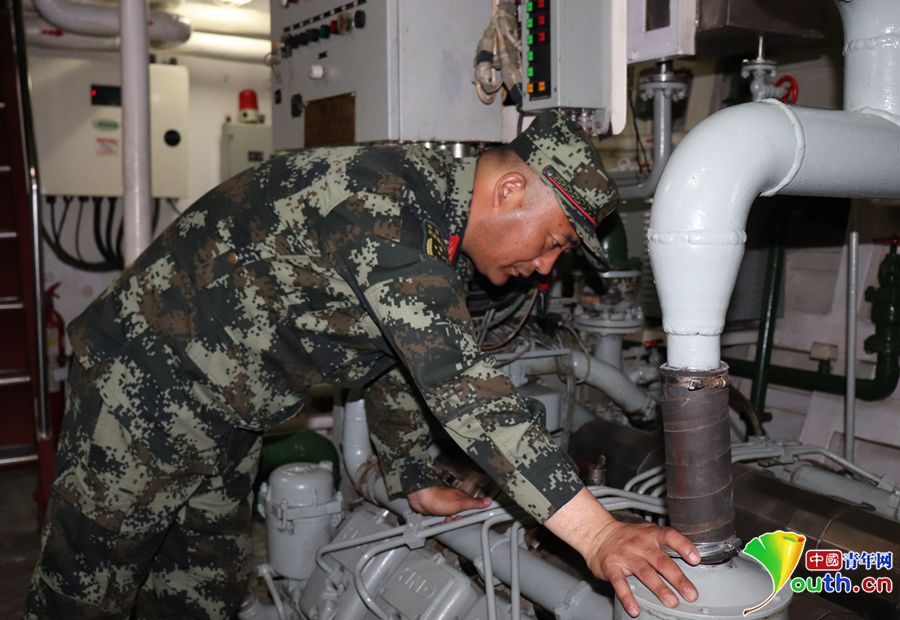 他是常年“扎根”机舱,“嗓门最大”的兵刘宝海。习惯在轰鸣的机器间工作的他,无论何时,声音都习惯性地提高数分贝,因此,战友们常常这样和他玩笑,“哎呀宝海,你说话声音咋恁大呢!”说起执勤经历,刘宝海永远记得2014年4月,孩子刚出生5天,正沉浸在幸福中的他,突然被紧急召回,这一走便是3个月。那段时间,刘宝海常想和家人通一次电话,听听老婆孩子的声音,但是任务在身,要24小时不间断值守在50多度高温机舱内。期间一次回港避风,他本来有机会和家人说句话,可是由于机器24小时运转损害特别大,一靠岸,刘宝海便开始更换滑油,一直忙到凌晨3点多。为了不打扰家人休息,一直想要打通电话的他,终究没有拨出去。