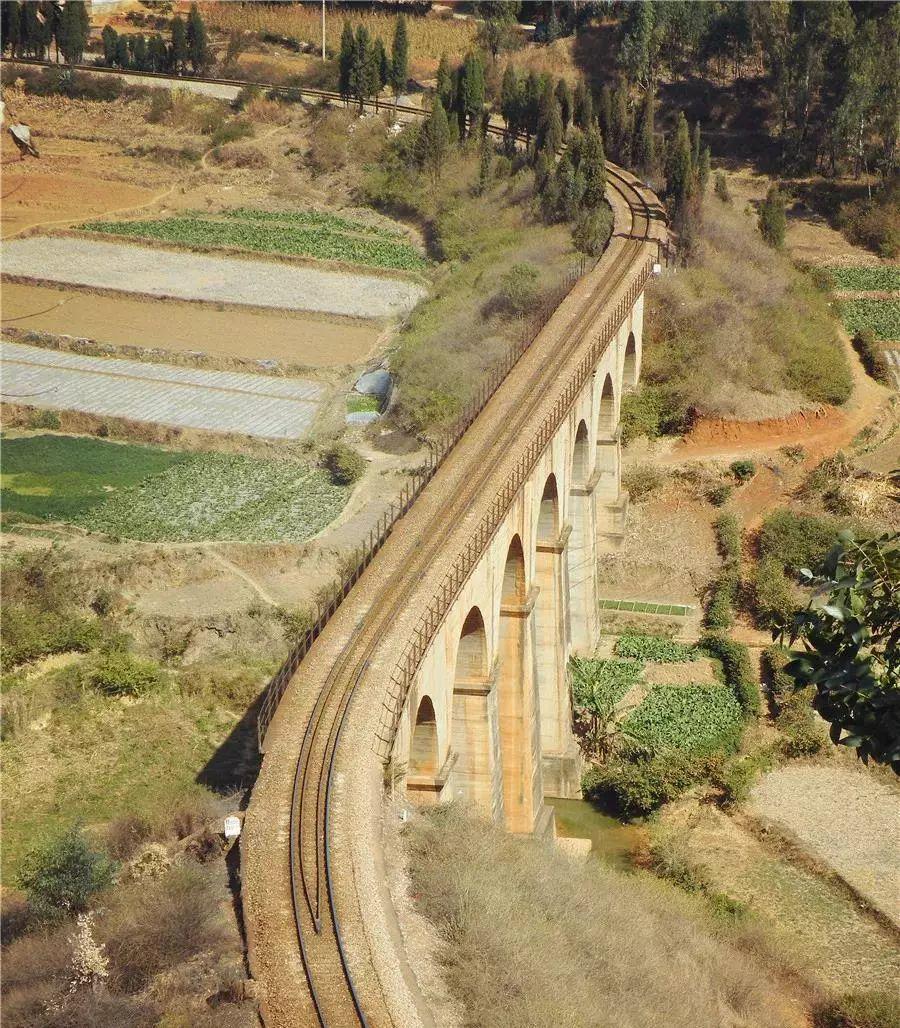 云南地处云贵高原,地势复杂。滇越铁路滇段的修筑浩大而艰巨,沿线山峦陡峭,流水穿梭,有桥梁175座,线路最大坡度30‰,最小曲线半径80米。