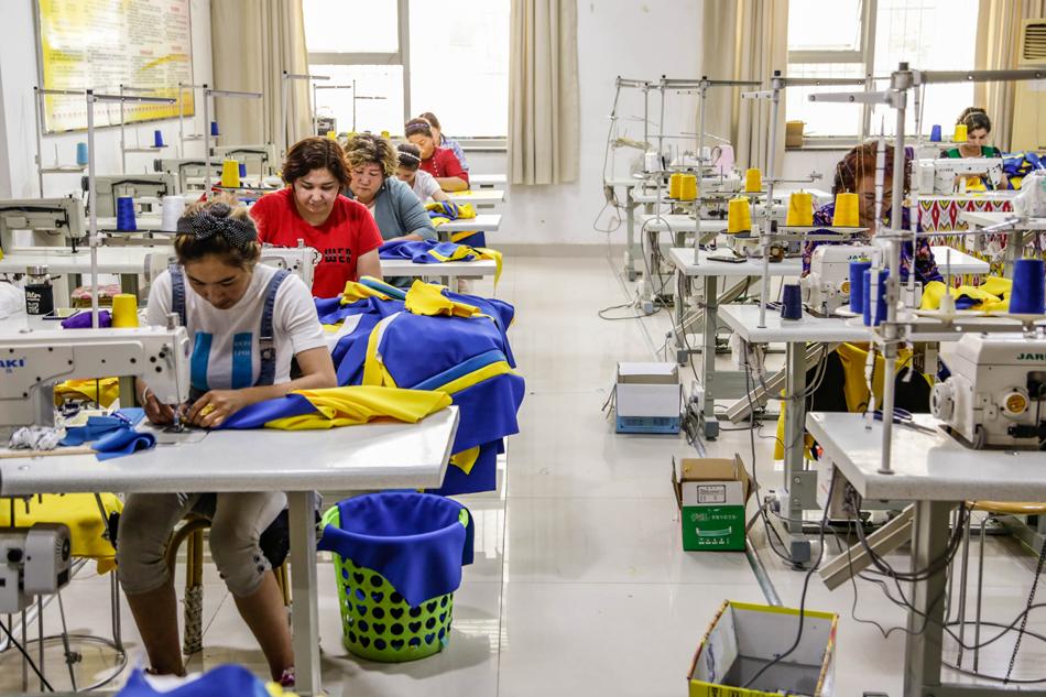尉犁县达西村的手工艺农民合作社缝纫车间内,来自本村的女工们正在认真工作。发展乡村旅游