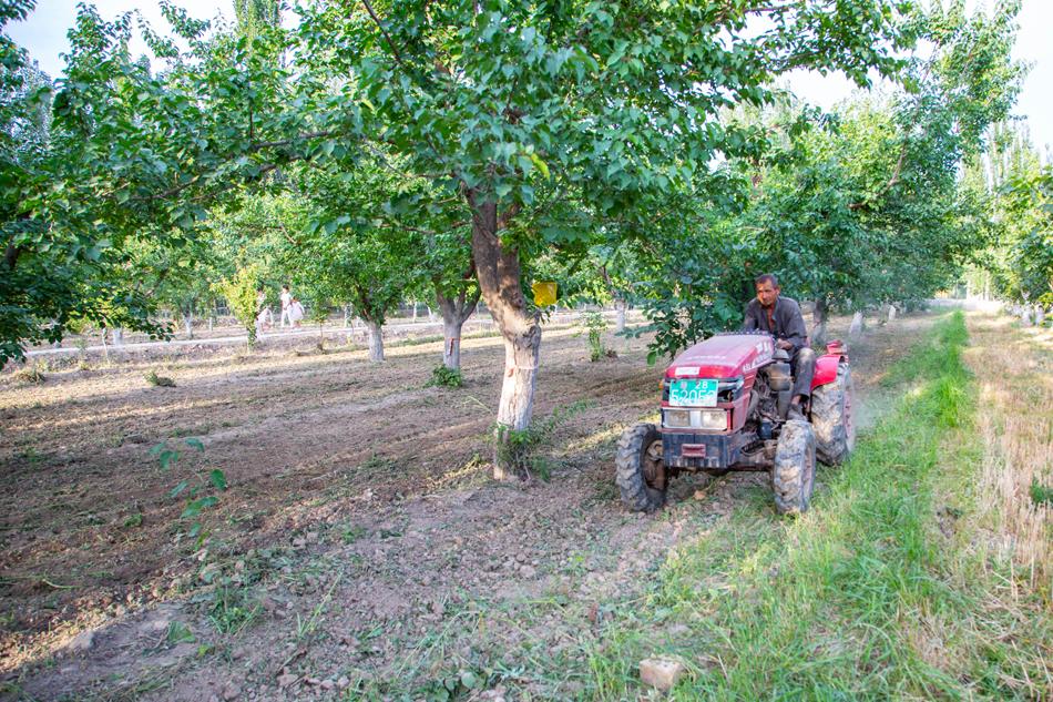 一位村民在自家的果园里开着拖拉机为果树松土除草。