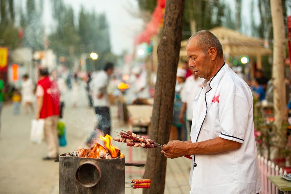 “杏花村”的风情一条街街边,美食摊主正在炭火上烤肉。
