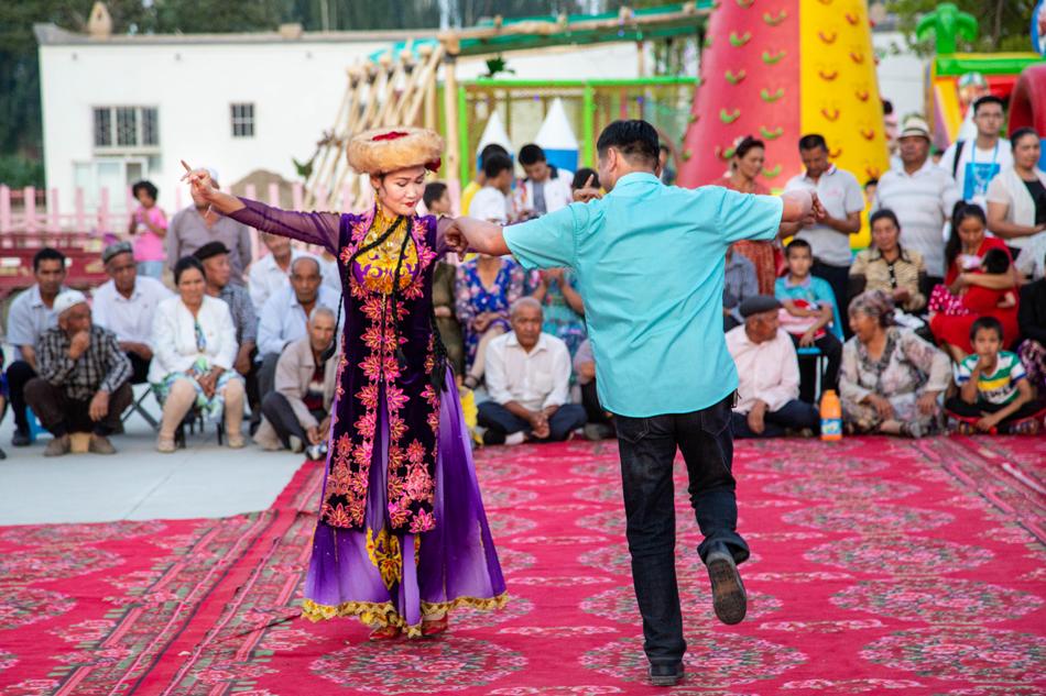 “杏花村”的文化广场正在举行一场文艺表演,两名舞者在舞台中央载歌载舞。