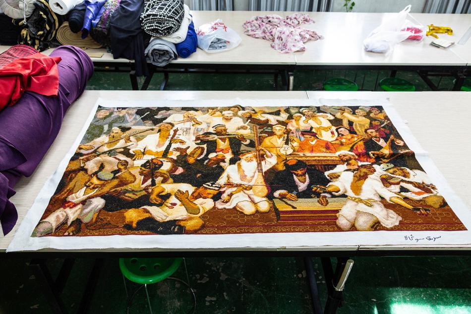 新疆阿克苏市依干其乡依干其村的手工艺合作社里,努尔曼古丽·胡加木尼亚告诉记者她店里的本土刺绣工艺品经常卖断货,桌上的这副刺绣成品也早已有了买家。