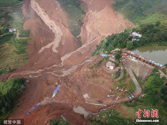 2019年7月25日,贵州六盘水,救援力量在现场展开救援工作,现场有8台挖掘机开始作业,救援人员正在搜寻失联者。图为7月25日,贵州六盘水,航拍水城县鸡场镇坪地村山体滑坡现场。王勤摄 图片来源:视觉中国