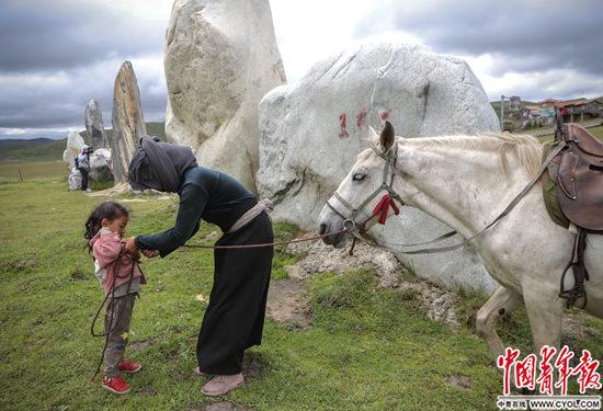 7月29日,四川省红原县日干乔大沼泽,罗日搓为女儿系扣子。她住在日干乔大沼泽景区附近,平时招揽游客在此体验骑马。如今,日干乔大沼泽已是全国经典红色旅游景区。中国青年报·中国青年网见习记者 孔斯琪/摄