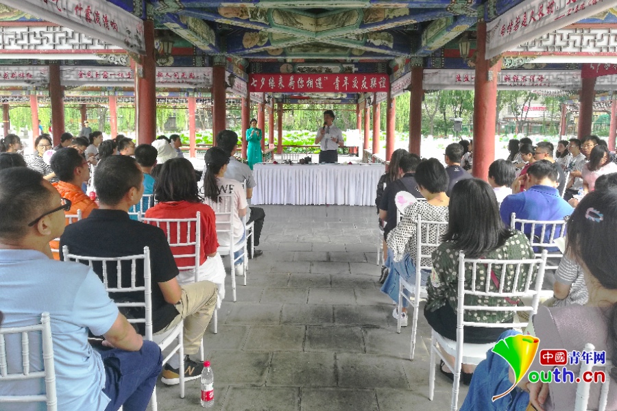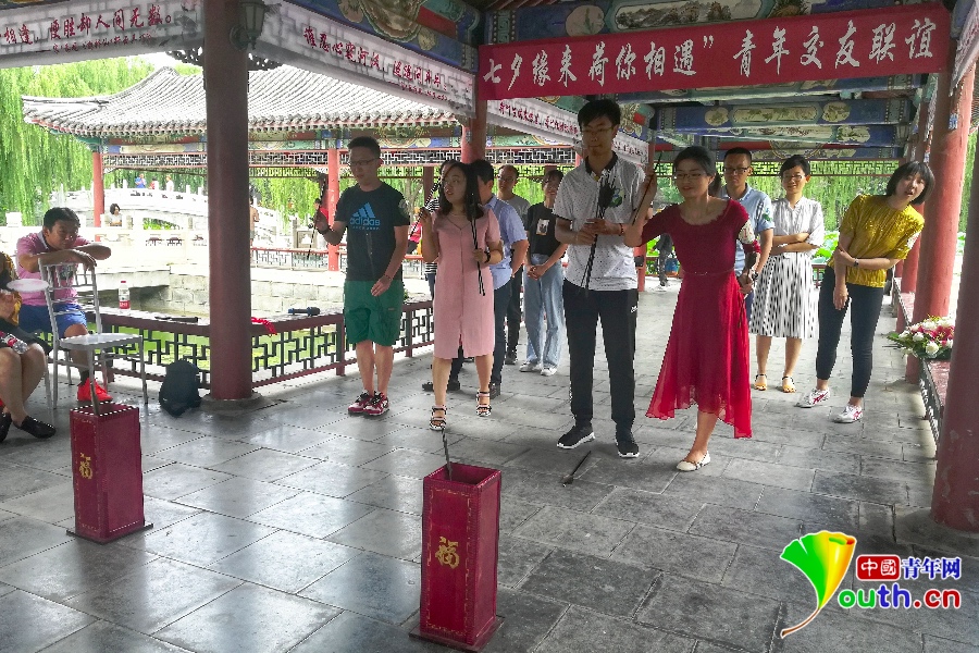 中国青年网北京8月5日电 (记者 张瑞玲) 在七夕节来临之际,朝阳区社区服务中心联合北京婚姻家庭建设协会在香河中信国安第一城组织开展“七夕缘来、荷你相遇”户外交友联谊活动,来自朝阳E恋平台的100余名单身青年参加。