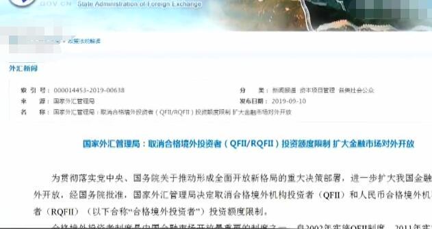 央视网消息: 经国务院批准,国家外汇管理局决定取消合格境外机构投资者(QFII)和人民币合格境外机构投资者(RQFII)投资额度的限制,取消单家境外机构投资者额度备案和审批,取消RQFII试点国家和地区限制。今后,具备资格的境外机构投资者只要登记就能够自主汇入资金,开展符合规定的证券投资。专家称,外资入场的便利程度进一步提高,将为中国带来更多境外长期资本。