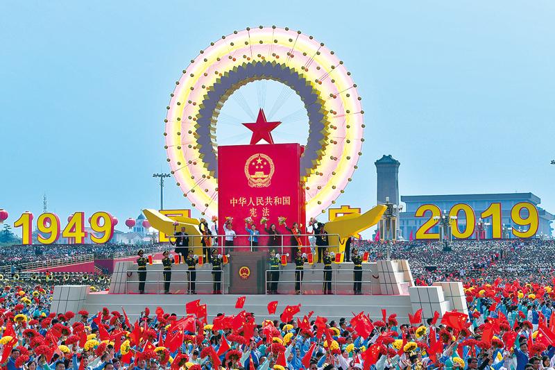 在“民主法治”方阵彩车上,人民大会堂五星穹顶造型星光灿烂,《中华人民共和国宪法》庄严神圣,金色大手托起的,是我们共同捍卫人民民主的决心,是我们共同捍卫宪法法律尊严的承诺。图为2019年国庆群众游行中的“民主法治”方阵。 新华社记者 刘潇/摄