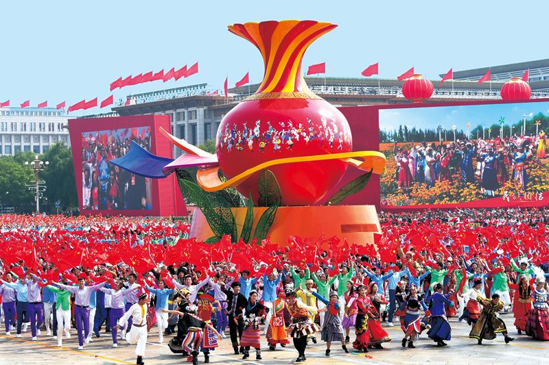 56个民族56枝花,56族兄弟姐妹是一家。“民族团结”方阵的各族群众,手拉手,载歌载舞。彩车上“石榴瓶”光彩夺目,各民族像石榴籽一样紧紧抱在一起,血脉相连,风雨同舟。图为2019年国庆群众游行中的“民族团结”方阵。 新华社记者 李晓果/摄