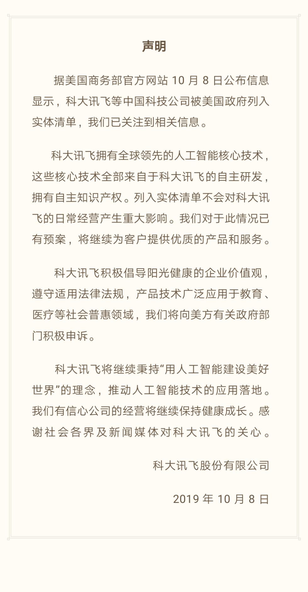 科大讯飞公告显示: 列入实体清单不会对科大讯飞的日常经营产生重大影响。我们对于此情况已有预案,将继续为客户提供优质的产品和服务。科大讯飞积极倡导阳光健康的企业价值观,遵守适用法律法规,产品技术广泛应用于教育、医疗等社会普惠领域,我们将向美方有关政府部门积极申诉。科大讯飞将继续秉持“用人工智能建设美好世界”的理念,推动人工智能技术的应用落地。我们有信心公司的经营将继续保持健康成长。感谢社会各界及新闻媒体对科大讯飞的关心。