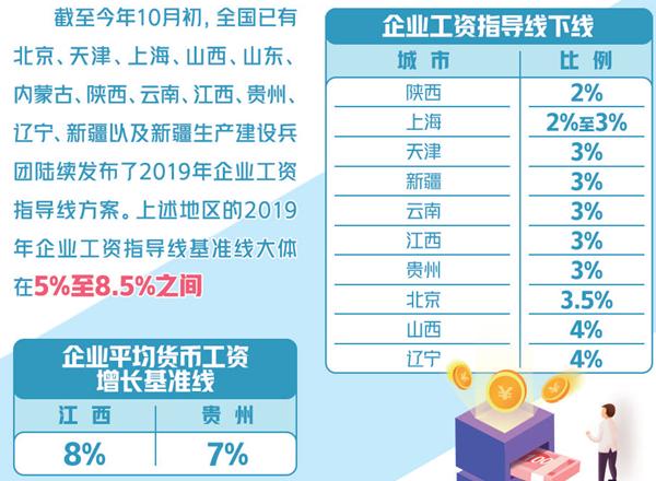 据经济日报-中国经济网记者不完全统计,截至今年10月初,全国已有北京、天津、上海、山西、山东、内蒙古、陕西、云南、江西、贵州、辽宁、新疆以及新疆生产建设兵团陆续发布了2019年企业工资指导线方案。上述地区的2019年企业工资指导线基准线大体在5%至8.5%之间。