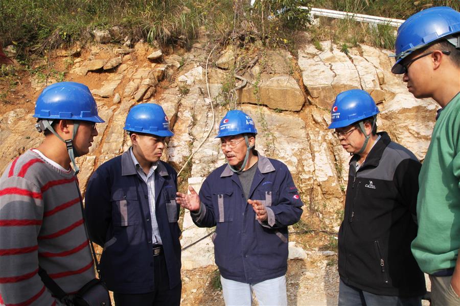 南仁东(中)在贵州黔南州平塘县大窝凼施工现场与工程技术人员在一起(2014年12月1日摄)。新华社发