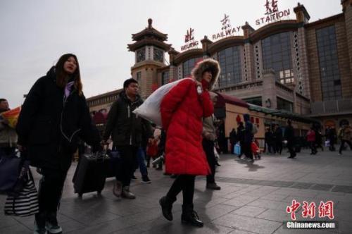资料图:图为旅客们走过北京站前。中新社记者 崔楠 摄