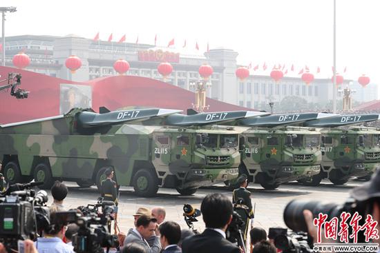 10月1日,庆祝中华人民共和国成立70周年大会上,东风-17常规导弹方队经过天安门广场。中国青年报·中国青年网记者 赵迪/摄