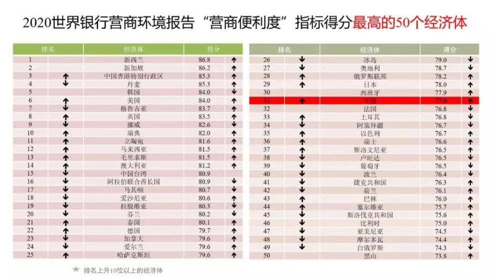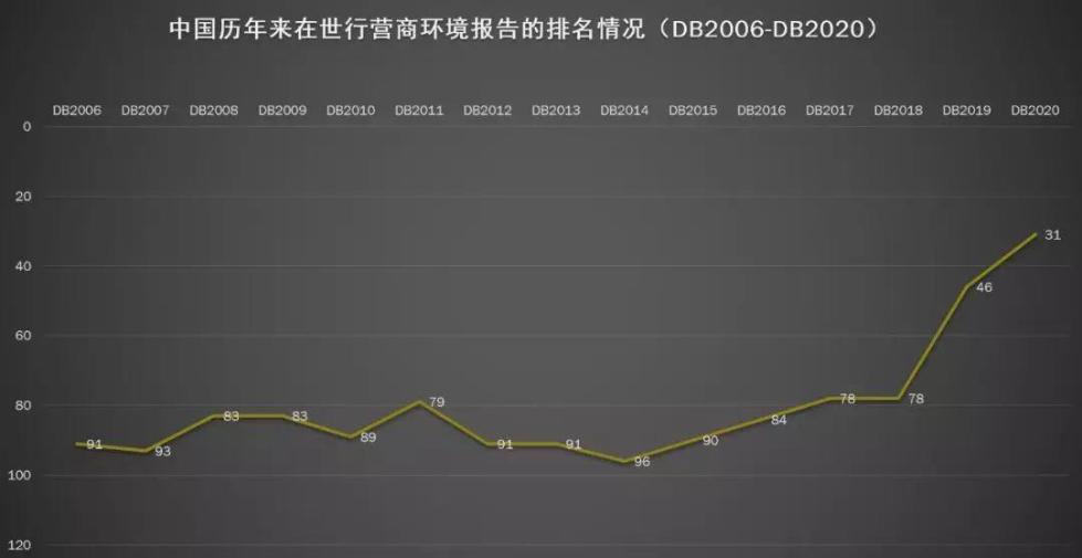 北京时间10月24日,世界银行发布《2020年营商环境报告》。中国的全球营商便利度排名继去年大幅提升32位后,今年又跃升15位,位居全球190个经济体的第31位,连续两年跻身全球优化营商环境改善幅度最大的十大经济体。