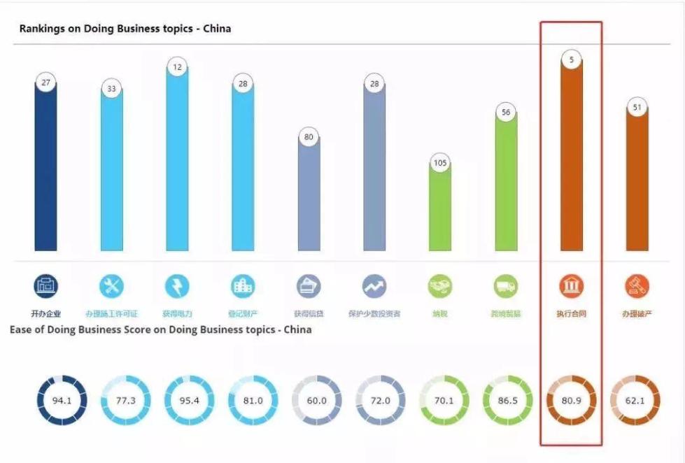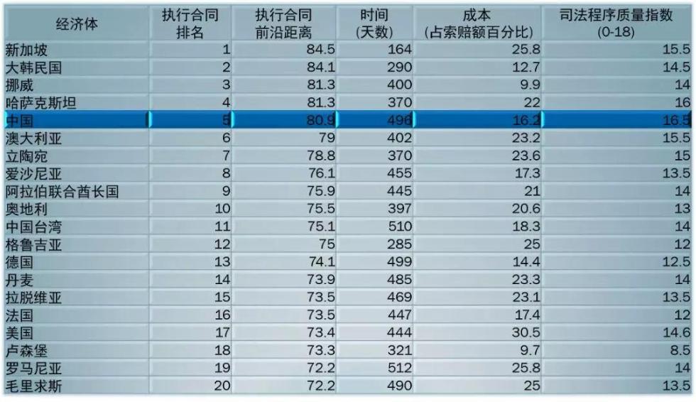 尽管如此,按照《2020年营商环境报告》,中国的“执行合同”指标还是前进1位,排名全球第5位,继续保持领先,距离排在首位的新加坡仅3.6分,超过中国台湾(第11位)、德国(第13位)、美国(第17位)和中国香港特别行政区(第31位)。其中,“司法程序质量”指数从15.5分提高至16.5分,再次被世行评价为这一领域的“全球最佳实践者”。