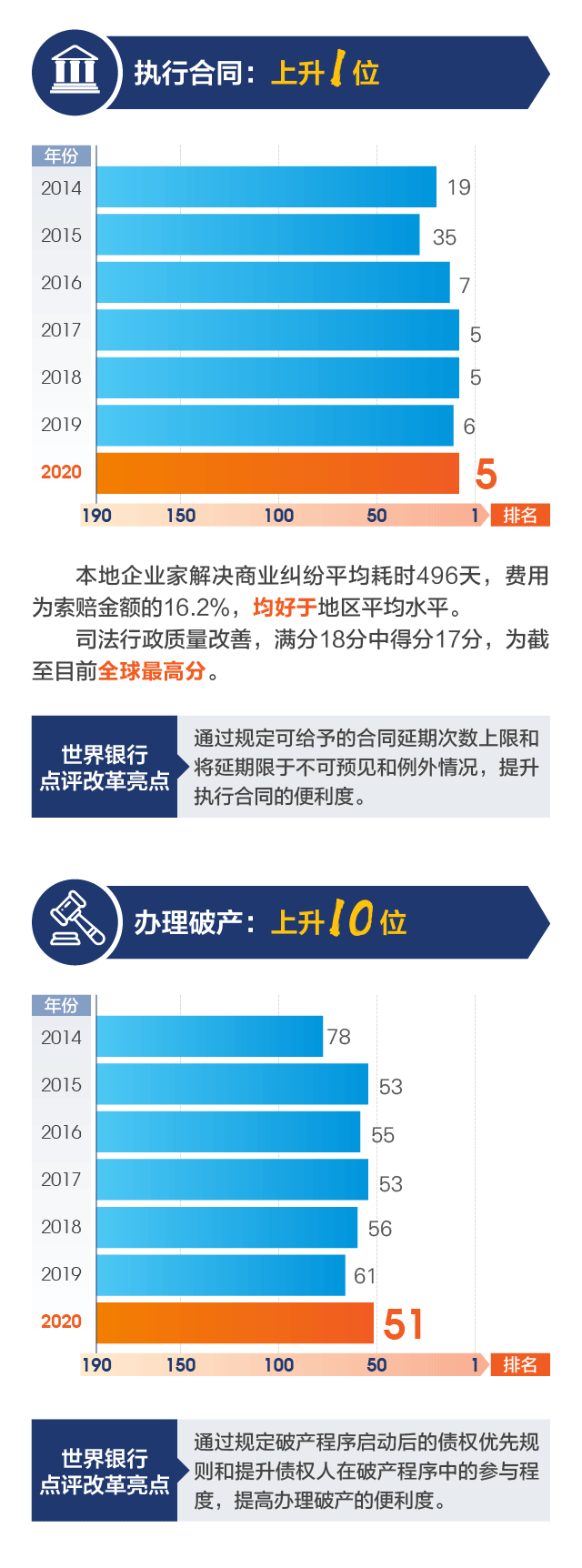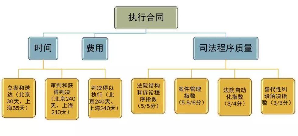 从时间维度上看,“执行合同”指标在世行2015年报告中还位列第35位,到2016年报告已跃升至第7位,此后一直保持在高水平,正好与全面深化司法体制改革的推进节奏同步。
