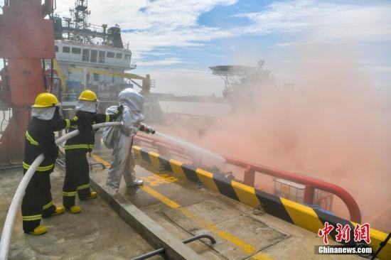 资料图:海南开展危险品码头船岸应急联合演习。图/骆云飞