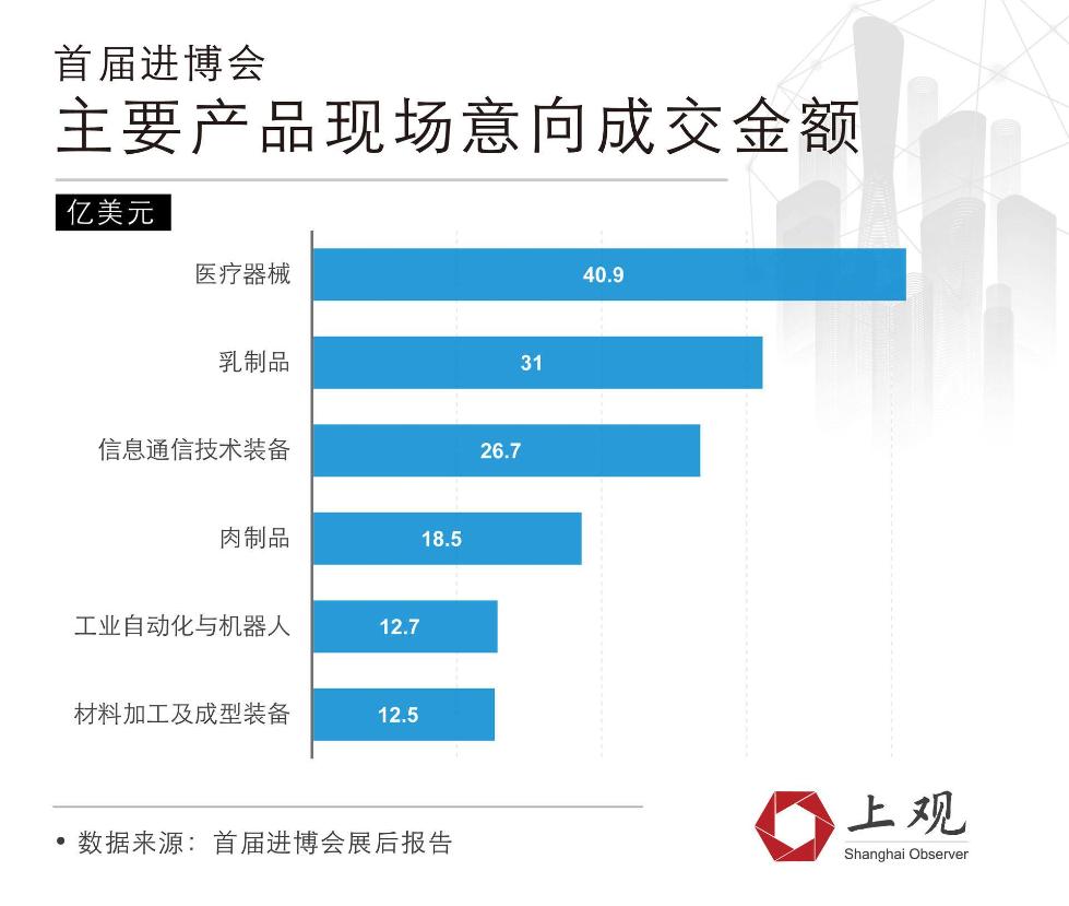 据首届进博会展会报告,去年医疗器械类产品 现场意向成交金额高达40.9亿美元,是主要产品中最高的。