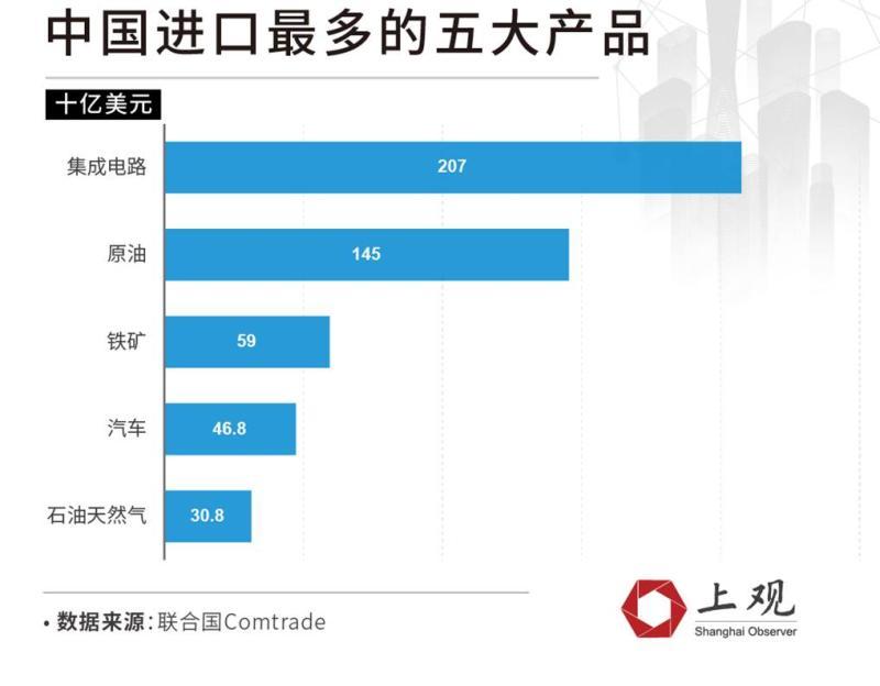 不过,中国进口货物中金额最大的还是集成电路。根据联合国贸易数据,中国在2017年共进口价值2070亿美元的集成电路商品,占当年总进口额的13%。而根据海关总署统计,2018年中国集成电路产品进口额为20584.1亿元人民币(约3120.6亿美元)。2019年尽管同比有所下降,但1-8月的进口额仍达到1921.24亿美元。