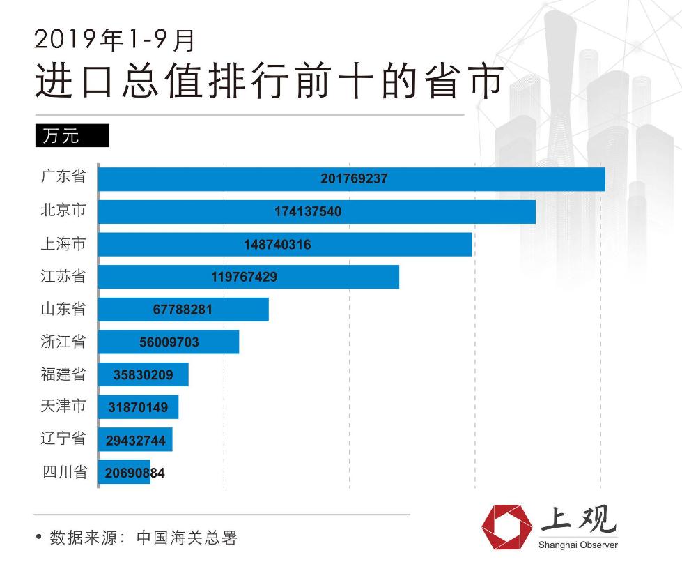 中国进口商品主要的供货地区为东部。2019年前9个月,以东部地区为收货地的进口额占全国的84.5%。进口额排名前10的省市中排名第一的是广东省。