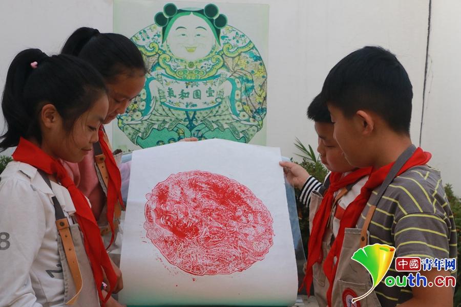 苏州姑苏区桃坞中心小学学生展示桃花坞木版年画。中国青年网记者 张玘云 摄