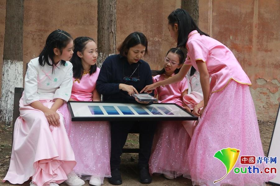 陈文和学生探讨缂丝作品。中国青年网记者 张玘云 摄