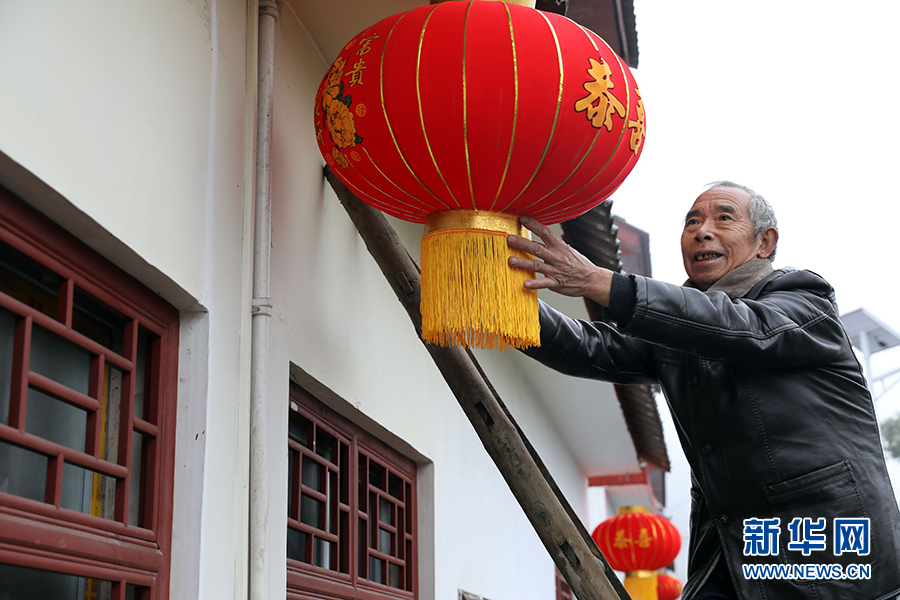 村民们在挂灯笼。新华网 发(杨元忠摄)