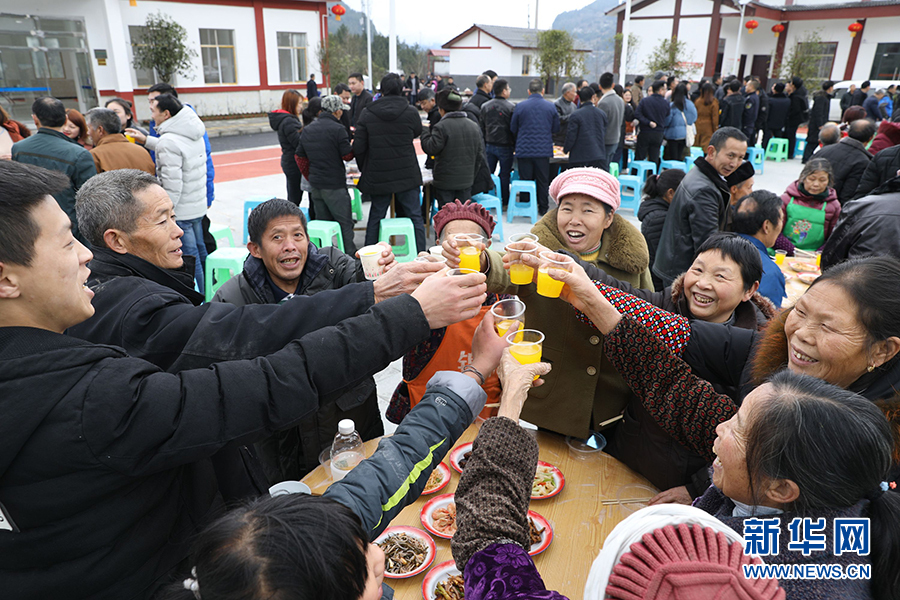 村民们在吃团年饭。新华网 发 杨元忠摄