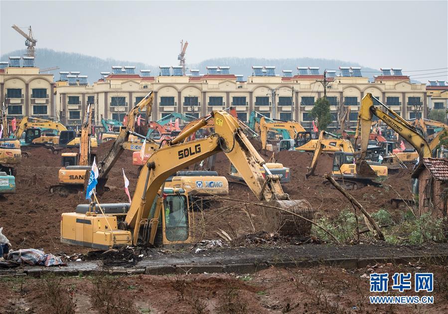 1月24日,在武汉蔡甸区知音湖武汉职工疗养院附近,大型机械加紧施工。 新华社记者 肖艺九 摄