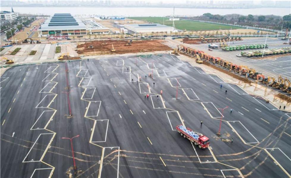 1月26日,在武汉雷神山医院建设工地,大型机械加紧施工(无人机照片)。新华社记者 肖艺九 摄