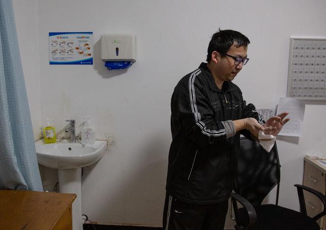 1月29日,武汉市汉口医院,一名医生结束值班后洗手,办公室里休息床位不够,他准备回家休息。每天多次穿脱防护服,他的脸已被护目镜和口罩压出了印,手也因为长时间戴两层不透气的医用手套和反复清洁消毒而发白。他所在的并非呼吸或传染病相关科室,目前由5名医生负责60多名轻症新冠肺炎患者的治疗,一天前有12名症状加重转出。大年初一接到医院通知后,该科室在用4小时紧急整理改造病区和办公室,开始收治发热病人。许多值班的医生至今没能回家休息,每天只能在办公室睡两三个小时。中青报·中青网记者 李峥苨/摄