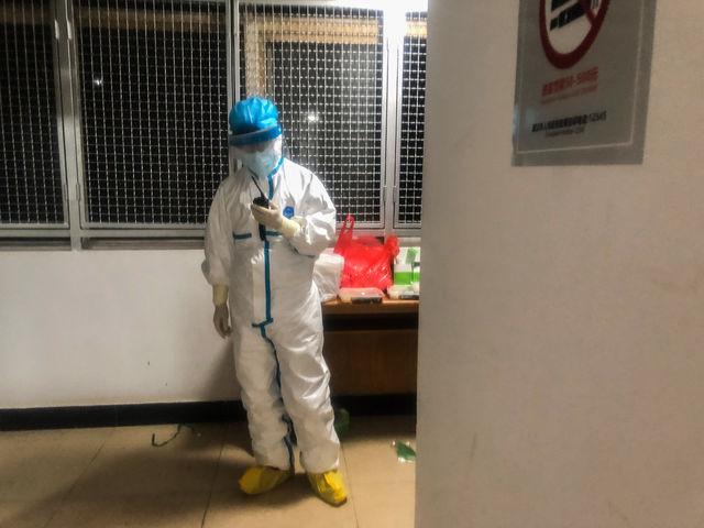 1月29日,武汉市汉口医院轻症新冠肺炎患者病房外,一位身着全套防护服的医护人员用对讲机与同事沟通。中青报·中青网记者 李峥苨/摄