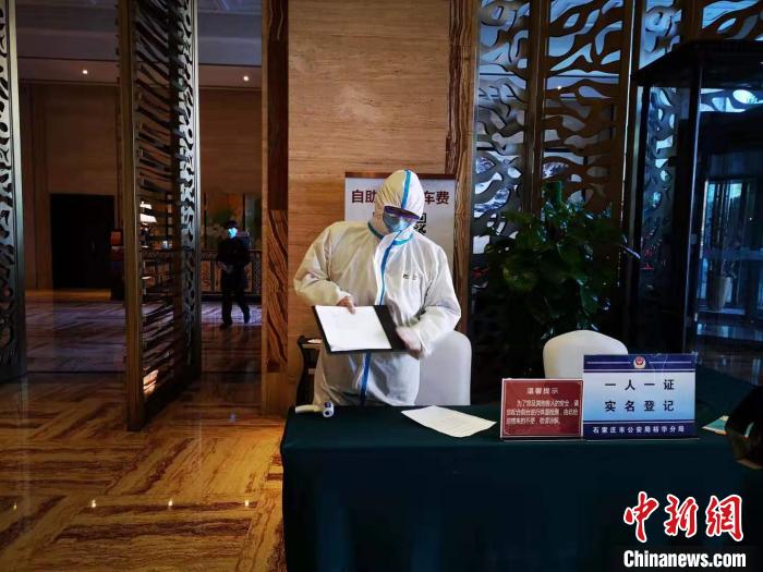 以往热闹的石家庄中茂海悦酒店也显得十分冷清,两栋提供住宿的客房楼宇只开放了一栋。拥有多个入口的停车场也只开放了一个出入口,停车场内车辆寥寥。酒店大堂前,清洁工人正在用消毒水对玻璃、门把手进行清洗消毒。大堂进口处,一名身穿防护服的工作人员正坐在前台。