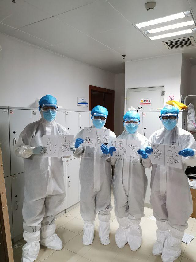 因为听不懂武汉方言,又想让呼吸不畅的患者尽量少说话,年轻人想了各种办法。他们把喝水、冷热、大小便等常用语以漫画的形式画出来,让患者指图作答。
