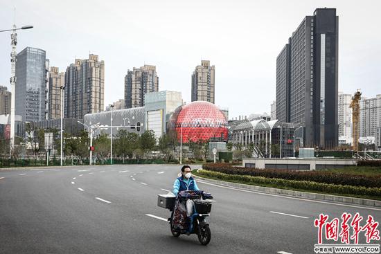 2月24日,湖北省武汉市光谷广场旁,一名行驶中的快递员。