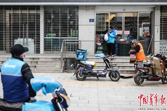 2月24日,湖北省武汉市,30岁的王凯(左)在一家便利店前等待接单。目前,这家便利店的销售已经基本上全部采用线上购买的方式。
