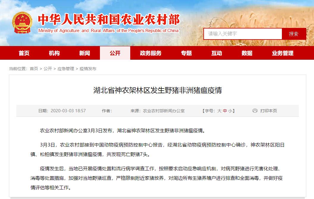 3月3日,农业农村部接到中国动物疫病预防控制中心报告,经湖北省动物疫病预防控制中心确诊,神农架林区阳日镇、松柏镇发生野猪非洲猪瘟疫情,共发现死亡野猪7头。