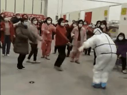 她带领患者一起跳舞。新疆第二批支援湖北医疗队副领队、临时党支部宣传委员巴哈古丽·托勒恒在武汉市客厅方舱医院C区工作,这里收治的患者得知医护人员是从新疆来的,纷纷要求她教跳舞,没想到真的安排上了。一段简单的舞蹈,传递着乐观的力量,也增强了大家战胜病魔的信心。