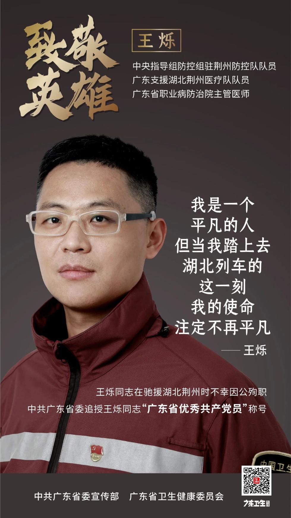 王烁,男,1984年1月生,辽宁新民人,2009年6月加入中国共产党,生前系广东省职业病防治院职业卫生评价所主管医师。2020年2月17日起,作为中央指导组防控组驻荆州防控队队员、广东对口支援湖北荆州医疗队队员,支援湖北荆州开展防控疫情流调排查和巡回督导等工作。2020年3月13日晚在实地走访查看社区疫情防控工作时,被一辆急速行驶的面包车从后侧撞倒,经抢救无效,不幸因公殉职。