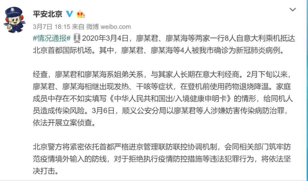 3月4日,廖某君、廖某海等两家一行8人自意大利乘机抵达北京首都国际机场。其中,廖某君、廖某海等4人被北京市确诊为新冠肺炎病例。经查,2月下旬以来,廖某君、廖某海相继出现发热、干咳等症状,在登机前使用药物退烧降温。家庭成员中存在不如实填写《中华人民共和国出/入境健康申明卡》的情形,给同机人员造成传染风险。3月6日,北京顺义公安分局以廖某君等人涉嫌妨害传染病防治罪,依法开展立案侦查。