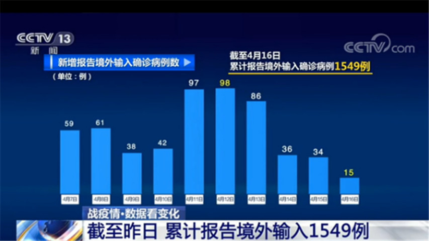 近10天来,报告新增境外输入确诊病例最多的一天是12日,为98例,昨天这一数字是15例,是近10天来最少的一天,也是本月报告新增境外输入确诊病例最少的一天。截至昨天,累计报告境外输入确诊病例达到1549例。目前,境外疫情形势依然严峻,要继续严防境外疫情输入。