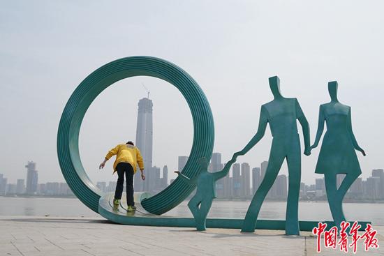 武汉解封之后,一位武汉市民在江滩玩耍。