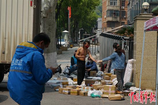 武汉一所高校封闭管理,校内的快递都堆放在门口。